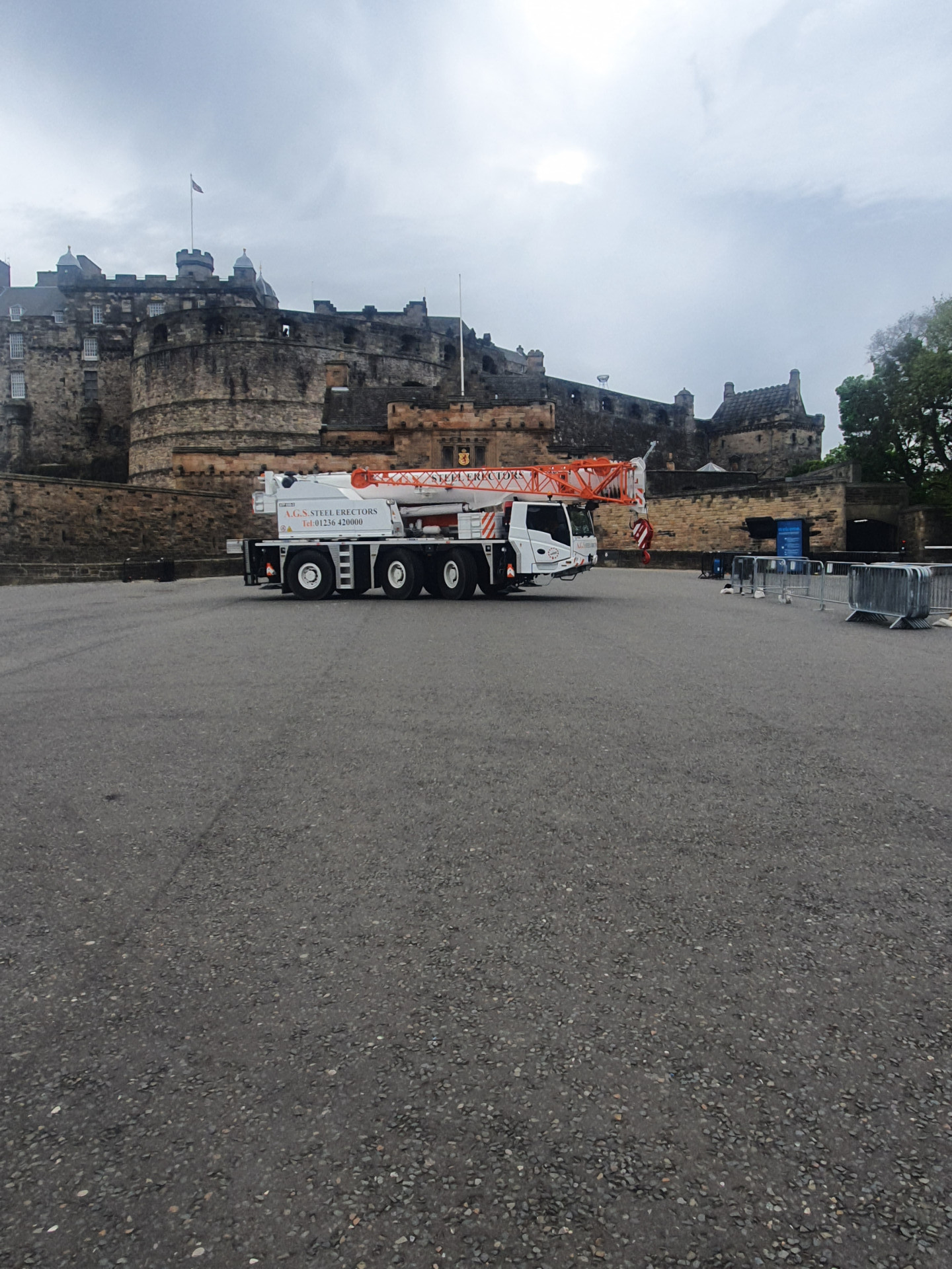 Entsprechend großzügig sind die beiden Tribünen rechts und links des Freiplatzes vor dem Schloss dimensioniert: Mit einer Höhe von bis zu 22 m und einer Länge von jeweils 90 m bieten sie Platz für 8.825 Zuschauer. „Insgesamt werden wir 650 Tonnen an Stahlkomponenten aufbauen“, berichtet Allan Cunningham von AGS Steel Erectors. Für diese Arbeiten wird sein Unternehmen ausschließlich All-Terrain-Krane von Tadano zum Einsatz bringen, und zwar den ATF 70G-4 und den neu angeschafften ATF 60G-3, die seit Anfang Mai vor Ort sind und sogar schon vor dem Festival zahlreiche Zuschauer anlocken.