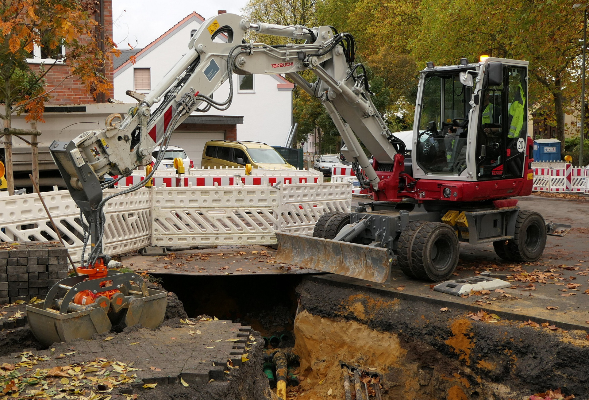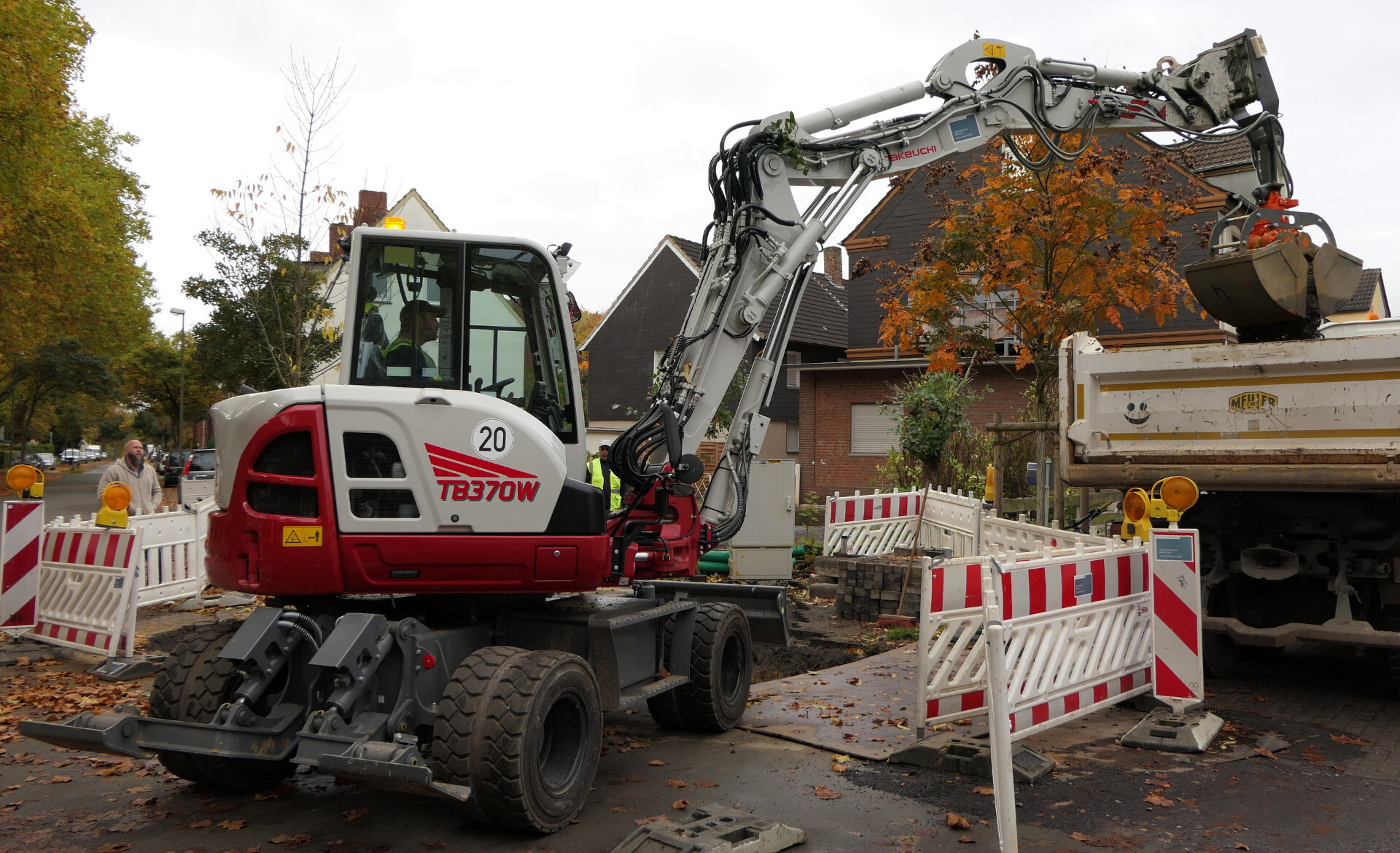 „Schnell müssen sie sein, standfest und genau arbeiten können“, sagt Oleg Heinz, Betriebsleiter der SL Infrastrukturbau aus Lünen. Die Firma ist Teil der Stadtwerke Lünen und vornehmlich für Bau und Unterhaltung des Leitungsnetzes zuständig. Für die Mobilbagger bedeutet dies, häufige Ortswechsel auf eigener Achse und sehr genaues Arbeiten in und an den Leitungsgräben und -schächten. Aktuell müssen sie in Lünen in verschiedenen Straßen mehrere Kilometer Leitungsgräben ausheben. Eine wichtige Voraussetzung ist Standfestigkeit. Der niedrige Schwerpunkt der TB 370 W und 8-fach-Bereifung sind die sichere Basis. Das grundsolide Planierschild sorgt für noch mehr „Bodenhaftung“. „Wir haben zusätzlich Abstützpratzen montieren lassen. Das bringt Sicherheit auch in sehr anspruchsvollen Bausituationen“, beschreibt Heinz.