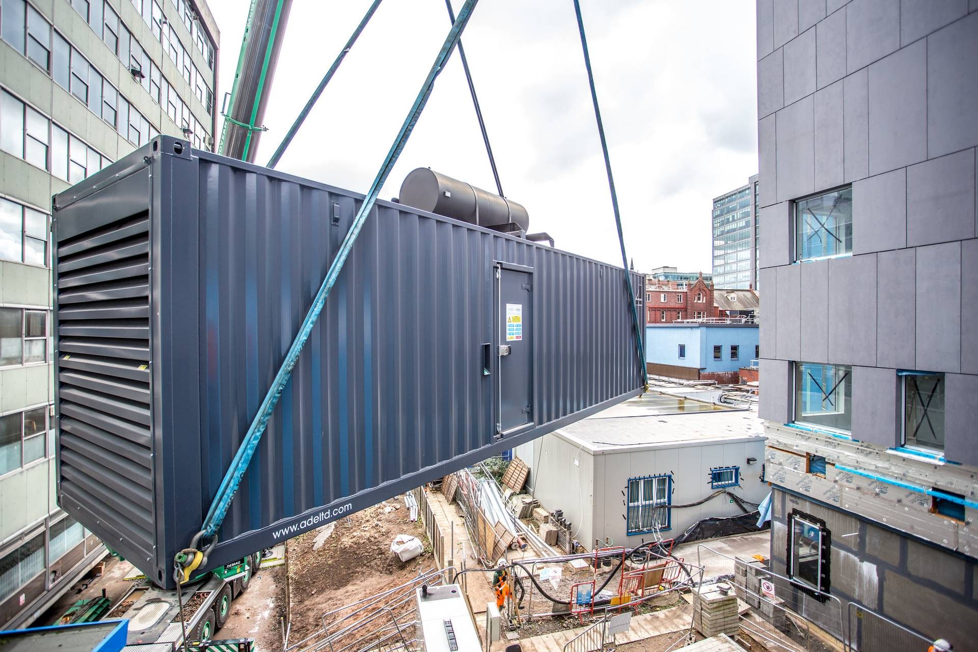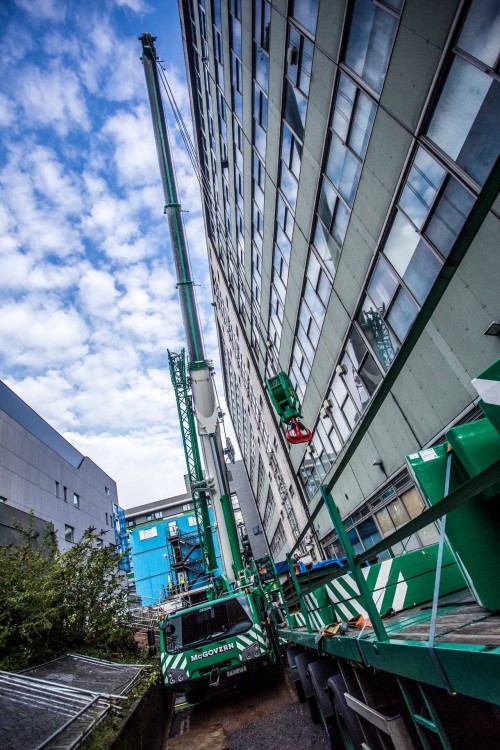 Zweibrücken, 12.07.2018 - Dieser Job hatte es in sich: Im Auftrag der UK Generator Manufacturer sollte der Krandienstleister McGovern Crane Hire aus dem mittelenglischen Derbyshire einen 21 Tonnen schweren Generator auf dem Gelände des Kinderkrankenhauses in Birmingham heben. Im Grunde eine einfache Sache. Wenn nicht die äußerst beengten Platzverhältnisse gewesen wären, die den Einsatz eines ausreichend großen und starken Krans in der Zufahrt zum Krankenhaus unmöglich machten. Die Lösung war der Einsatz eines Demag® AC 220-5 All-Terrain-Krans, der kompakt genug für die Zufahrt war und zugleich dank der innovativen IC-1 Plus Steuerung ausreichende Hubkraft bei asymmetrischer Abstützung bot.