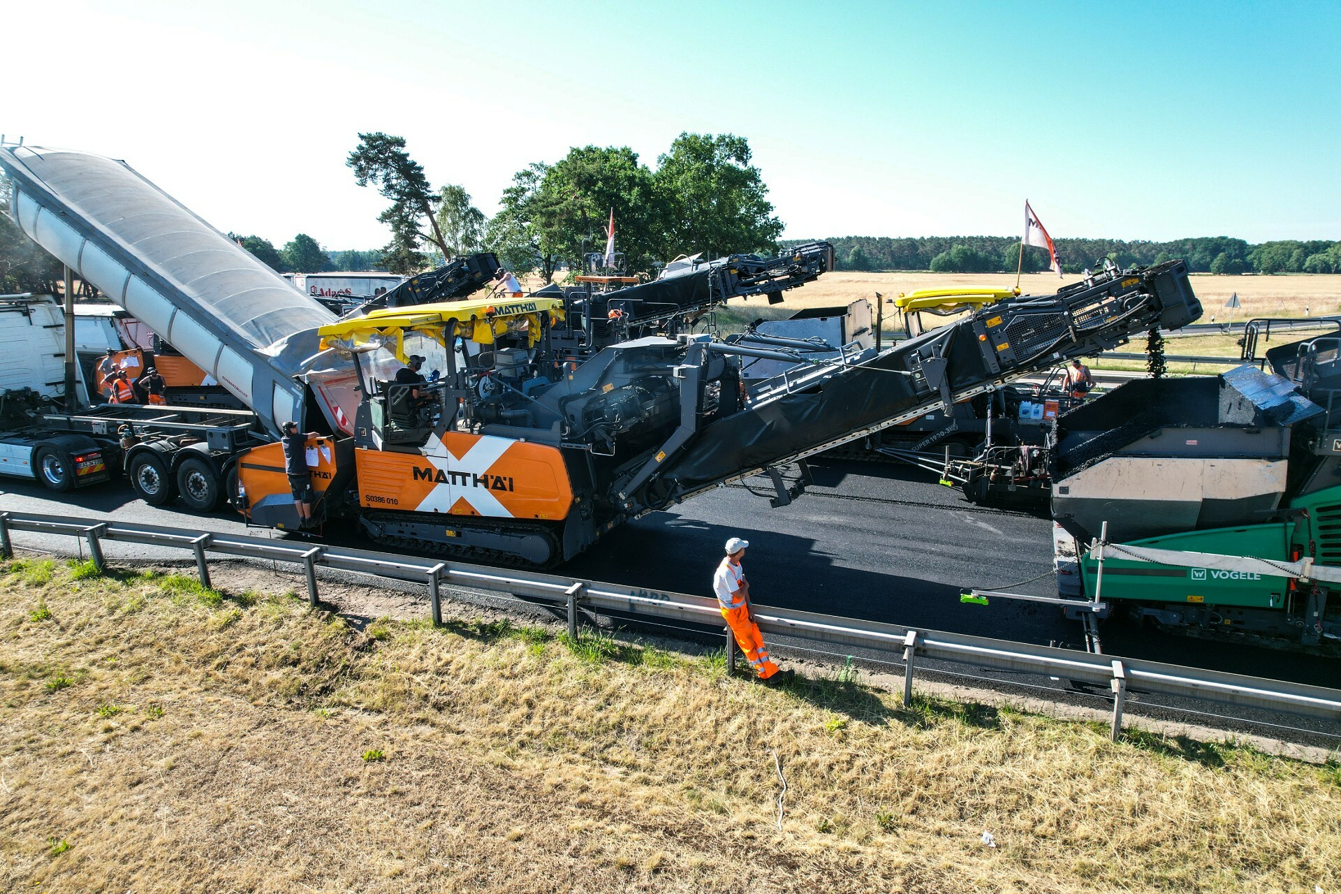 Das ausführende Unternehmen, eine ARGE aus Matthäi Michendorf und Matthäi Stendal, entschied sich deshalb für den „Heiß auf Heiß“-Einbau mit zwei InLine Pave-Maschinenzügen von Vögele. Beschicker, Binderschichtfertiger und Deckschichtfertiger arbeiten dabei jeweils „in line“, also hintereinander und bauen Deck- und Binderschicht in einem Arbeitsgang ein. Das hat gleich mehrere Vorteile: Der „Heiß auf Heiß“-Einbau von Binder- und Deckschicht sorgt für eine optimale Verzahnung beider Schichten, was wiederum Qualität und Nutzungsdauer der Deckschicht erhöht. Außerdem kann der Deckschichtanteil zugunsten der Binderschicht reduziert werden. Das verbessert zum einen die Stabilität des Belags, weil der Anteil an standfester Binderschicht größer ist. Verformungen werden dadurch vermieden. Zum anderen spart das Kosten, weil weniger bindemittelreiches Deckschichtmaterial notwendig ist, das im Vergleich zum Binderschichtmaterial deutlich teurer ist. Anders als beim konventionellen Einbau entfällt außerdem das Anspritzen mit Bitumenemulsion, was Material, Co₂-Emissionen und Arbeitszeit spart. „Das InLine-Pave-Verfahren ist für Autobahnprojekte und Maßnahmen ideal, bei denen unter großem Zeit- und Kostendruck ein besonders belastbarer Belag eingebaut werden muss und Nachhaltigkeitsaspekte eine Rolle spielen“, sagt Frank Jilge, Einbaumeister bei Matthäi.