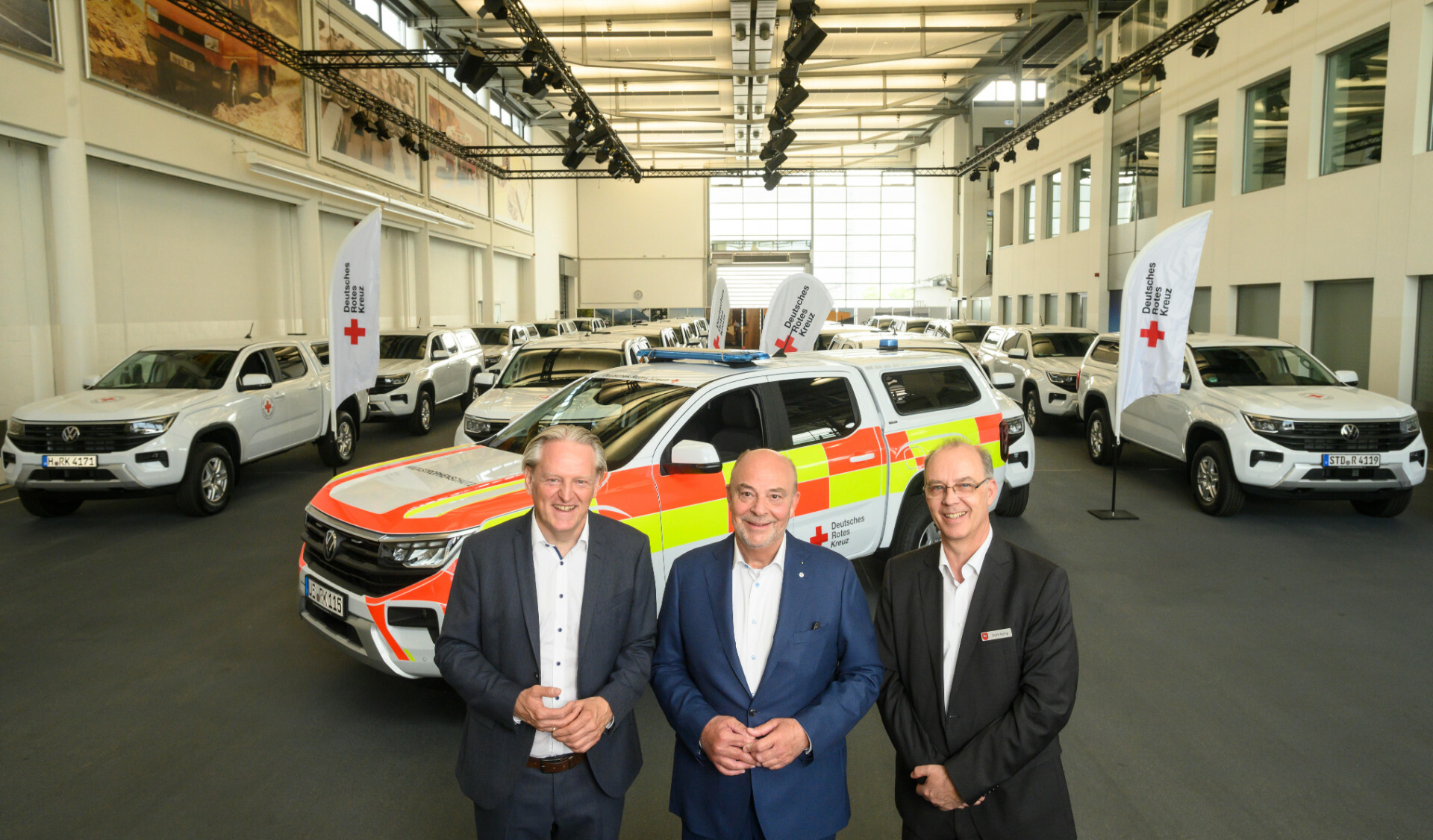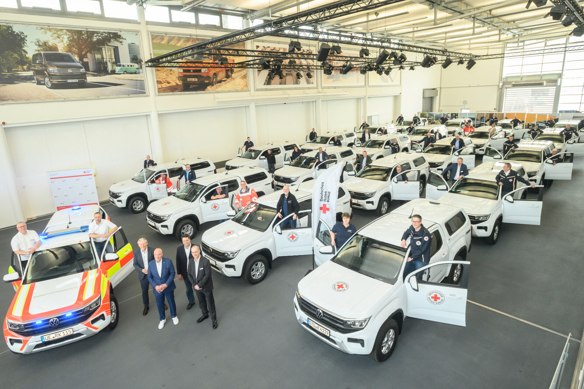 Hannover - Bundesverband, Landesverband und Kreisverbände des Deutschen Roten Kreuzes investieren gemeinsam 1,2 Mio. Euro in die Anschaffung von 22 geländegängigen Amarok von Volkswagen Nutzfahrzeuge (VWN) für den Katastrophenschutz in Niedersachsen. Die Übergabe der baugleichen, flexibel einsetzbaren Pick-ups an 21 niedersächsische DRK-Kreisverbände sowie den DRK-Landesverband Niedersachsen fand heute im VWN Kunden Center am Werk in Hannover statt.
