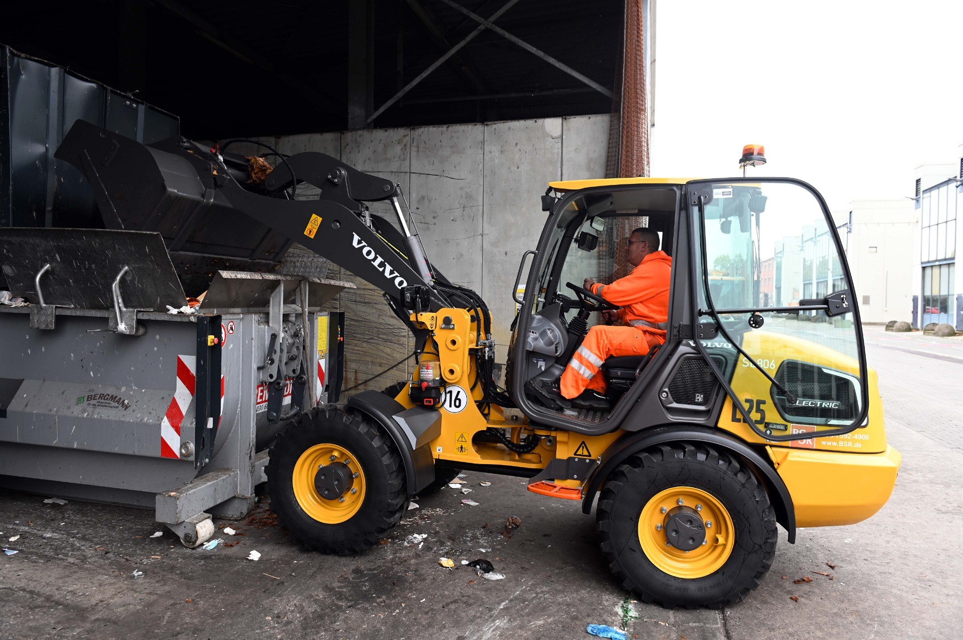 Bei der BSR wird nicht gekleckert, sondern geklotzt. Während andere Entsorgungsbetriebe allenfalls über einen Radlader mit Elektroantrieb nachdenken, schlagen die Hauptstädter gleich richtig zu und schaffen neun Volvo L25 Electric auf einen Streich an. Die Stromer der 5Tonnen-Klasse sind auf mehrere BSR-Liegenschaften im Berliner Stadtgebiet verteilt und kommen dort multifunktionell zum Einsatz. Ganzjährig schieben die Maschinen die Abfälle aus den 26.000 Papierkörben der Stadt in Boxen zusammen und verfrachten den Müll in Presscontainer. Im Winter kommt außerdem die Verladung von Tausalz und Splitt hinzu.