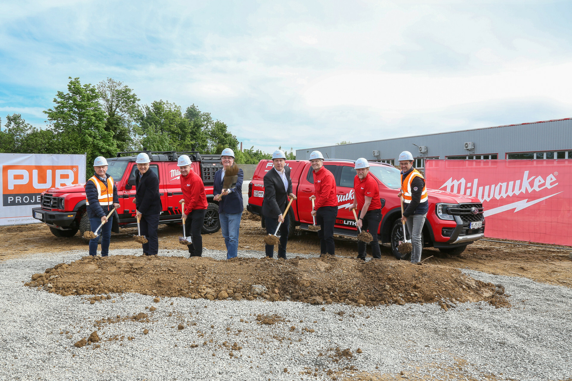 Spatenstich für neues Milwaukee Trainingszentrum in Winnenden mit Karl-Heinz Payr (Geschäftsführer, PUR Projektbau), Norbert Sailer (Erster Bürgermeister, Winnenden), Uwe Baumgartner (Leiter Einkauf & Facility, Techtronic Industries GmbH), Frank Berner (Geschäftsführer, kab architekten GmbH), Hartmut Holzwarth (Oberbürgermeister, Winnenden), Martin Landherr (Geschäftsführer Techtronic Industries ELC GmbH), Claude Aufrecht (Leiter Training, Techtronic Industries GmbH), Michael Haaf (Leiter Vertrieb, PUR Projektbau) – v.l.n.r.
