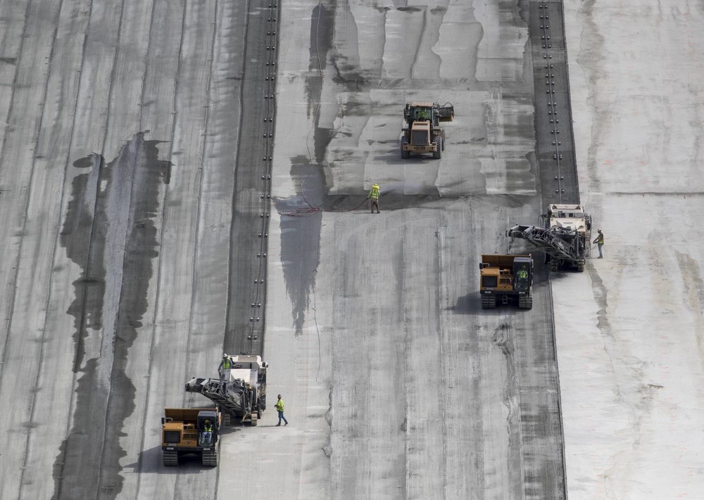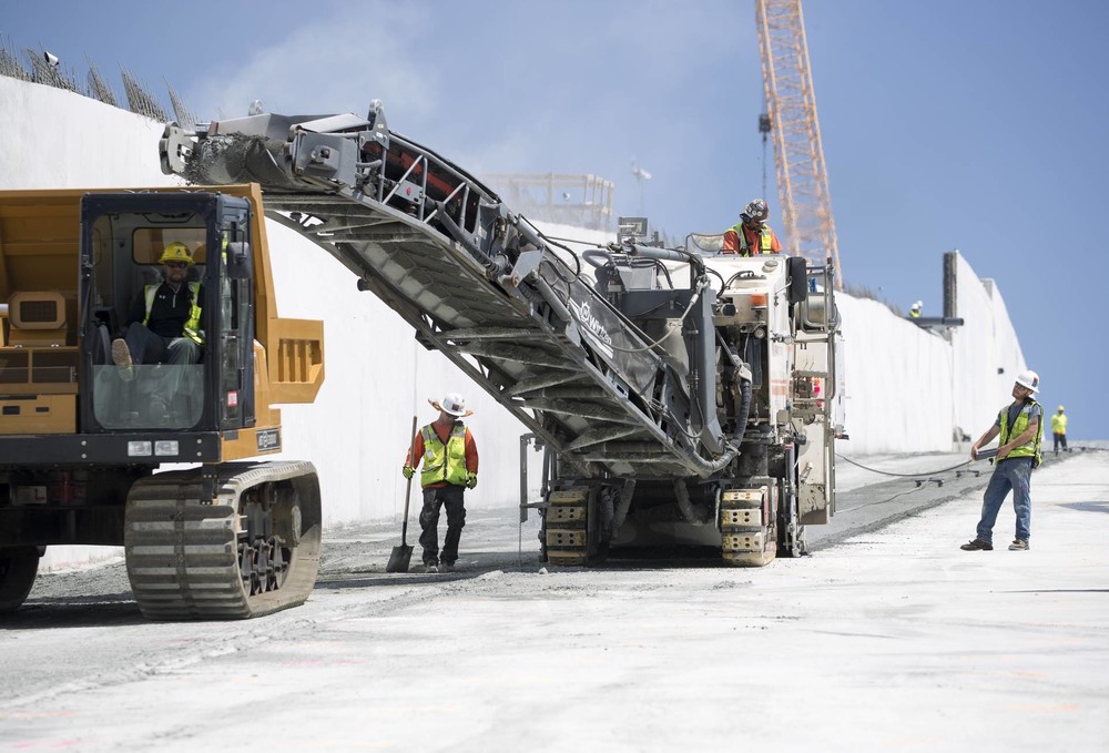 Nachdem Tieflader die Kaltfräsen an das obere Ende der Schussrinne gebracht hatten, wurden die Maschinen mithilfe von Gittermastkränen auf das Bauwerk gehoben und über extra angefertigte Rampen auf die sanierungsbedürftige Fläche gefahren. Dort wartete schon die nächste Herausforderung: Das Fräsen bei 30 Grad Gefälle. Die Lösung: Stahlseile mit einer Gesamtlänge von mehr als 450 m wurden an den Schaufeln eines großen Radladers und am Heck der Großfräsen befestigt und sicherten so die Fräsen während der Arbeiten. Die Seile wurden dabei auf mehreren hundert Rollwagen, die normalerweise für den Transport von schweren Möbeln genutzt werden, befestigt. Auf diese Weise scheuerten die schweren Stahlseile nicht auf dem Boden. „Durch die Rollwagen wollten wir verhindern, dass die Textur der frisch gefrästen Betonoberfläche beschädigt wird“, erklärt Tom Chastain, Anwendungsspezialist bei Wirtgen America.