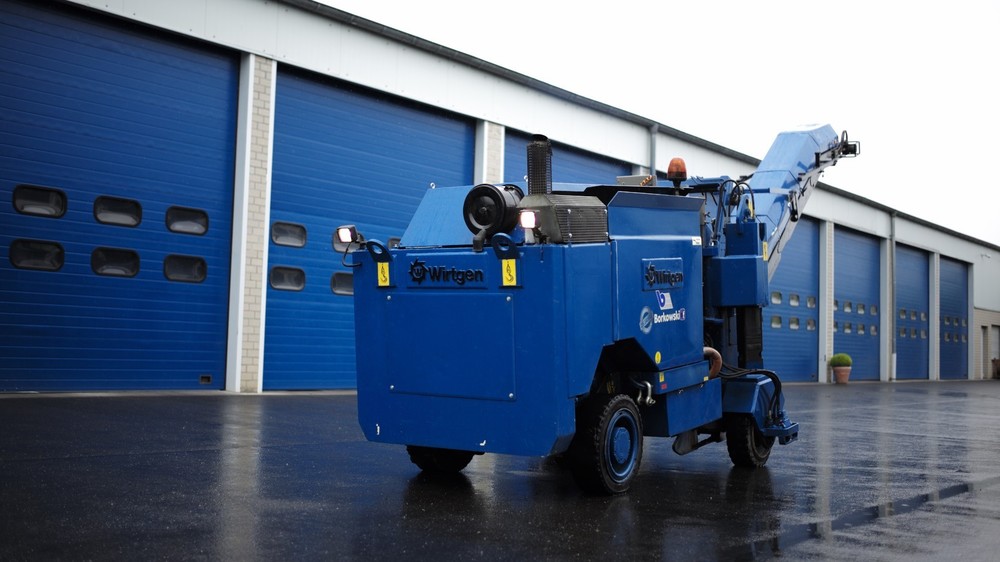 Als das leuchtend blau lackierte alte Schätzchen aus der Werksgarage fährt, ist das Erstaunen erst einmal groß. Ein massives Stück Stahl, das eher an eine kleine alte Diesellok erinnert – klobig, beinah roh im Vergleich zu den heutigen ergonomisch geformten Fräsen. Das Dach fehlt, von Assistenzsystemen, Kameras und High-Tech-Equipment keine Spur. Helmut Borkowski, seit 1990 selbstständiger Unternehmer und stolzer Besitzer des Prachtstücks, ist solche Reaktionen gewohnt. „Einmal waren wir mit der alten Dame bei Wirtgen im Werk, da sind alle aus der Werkstatt gerufen worden, um sie sich anzusehen. Und auf der Baustelle werden wir gerne mal belächelt, wenn wir mit unserer SF 1000 C auftauchen. Aber ihren Job macht sie nach wie vor einwandfrei und ist auch nach 30 Jahren noch genauso funktional wie damals!“![]()