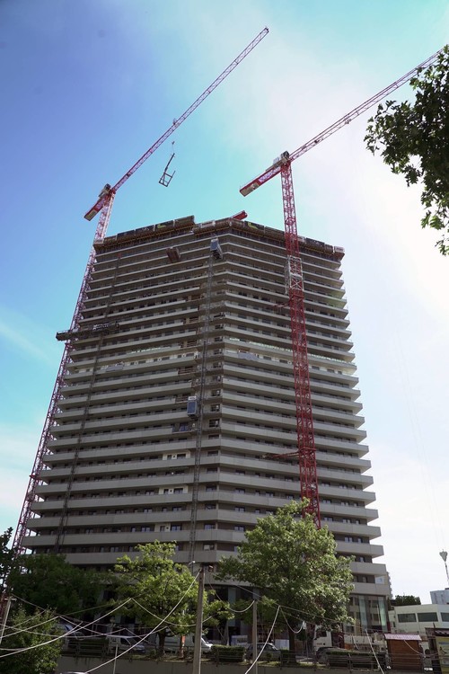 Da die Baustelle von einer stark befahrenen Straße umgeben ist und die behördlichen Auflagen eine Straßensperrung nicht zuließen, konnte die Montage mit einem 160-Tonnen Autokran nur im Baufeld selbst stattfinden. Das WOLFFKRAN-Team stattete beide Krane mit dem platzsparenden Turmsystem TV 20 mit nur 2 Metern Seitenlänge aus. Beide WÖLFFE wurden in zwei Etappen auf ihre Endhöhen geklettert. „Die Konstruktion der WOLFF-Krane lässt es zu, die Krane trotz des schlanken Turms und der großen Turmhöhen nur jeweils zwei Mal am Gebäude abzuspannen“, erläutert Herr Istok Kutos, Vertriebsleiter bei WOLFFKRAN Austria. „Das spart einerseits Kosten und andererseits wird der Baufluss durch wenige Abspannungen so wenig wie möglich gestört, was das Krankonzept für den Kunden besonders wirtschaftlich macht“. Eine kurzfristige bauliche Änderung erforderte zudem einen Tausch der Auslegerlängen der beiden Krane, was WOLFFKRAN flexibel ermöglichte.