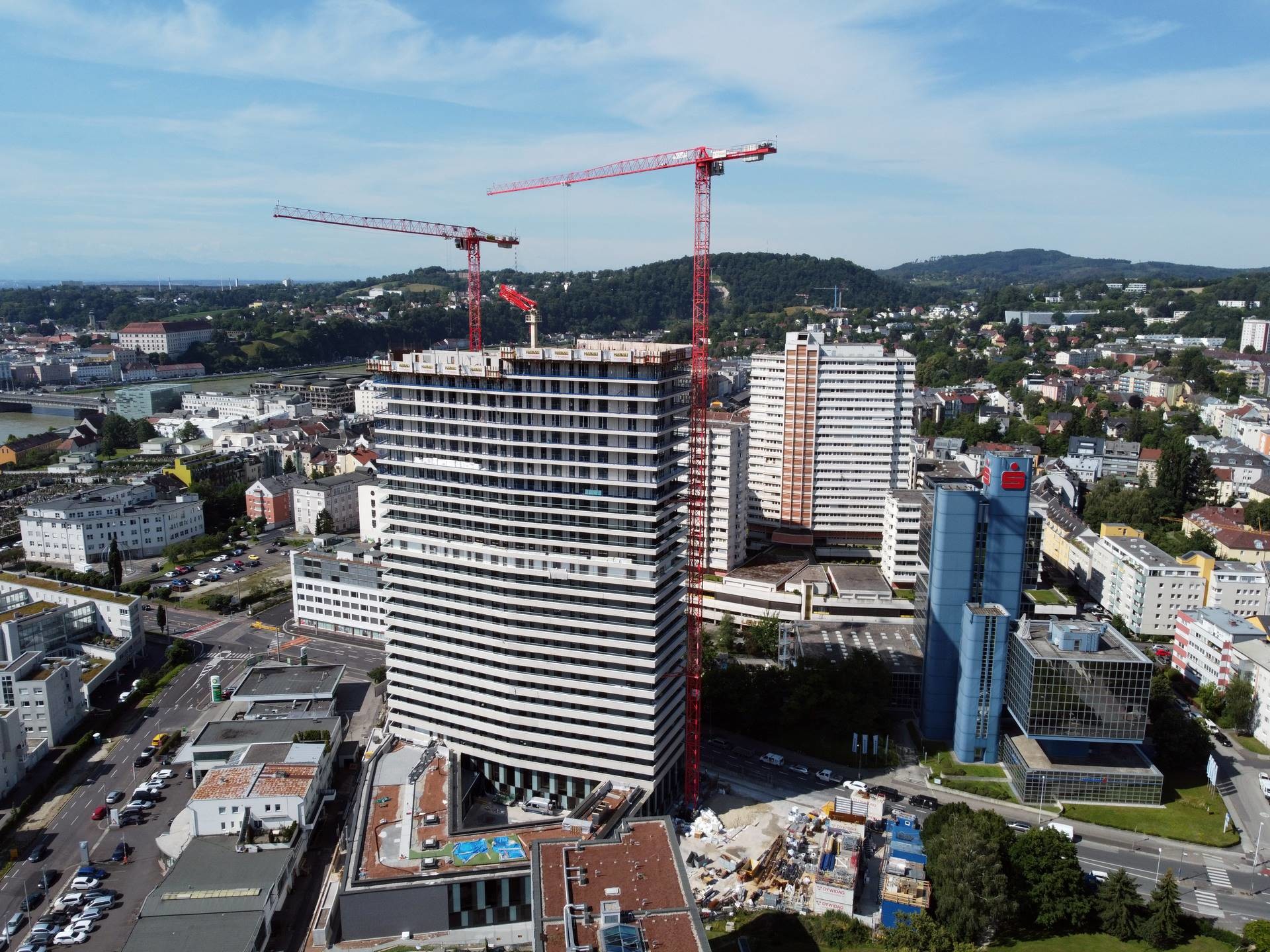 Am Bruckner Tower in Linz stehen aktuell zwei rote WOLFF-Krane mit 120,4 m und 131,6 m Hakenhöhen.