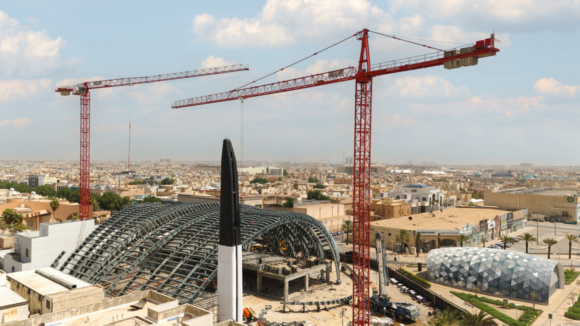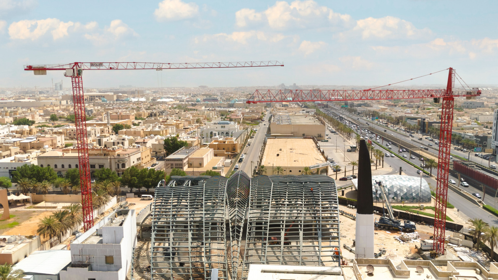 Ein WOLFF 6015.8 Clear (links) und ein WOLFF 7532.12 Cross errichten seit März die rund 5.300 m² große Sheikh Saleh Al-Rajhi Moschee an der King Abdullah Road in Riad. Die Krane ermöglichen präzise Hebevorgänge mit hoher Reichweite. Das herausfordernde Klima und ein hohes Verkehrsaufkommen erfordern eine durchdachte Planung des Kraneinsatzes.