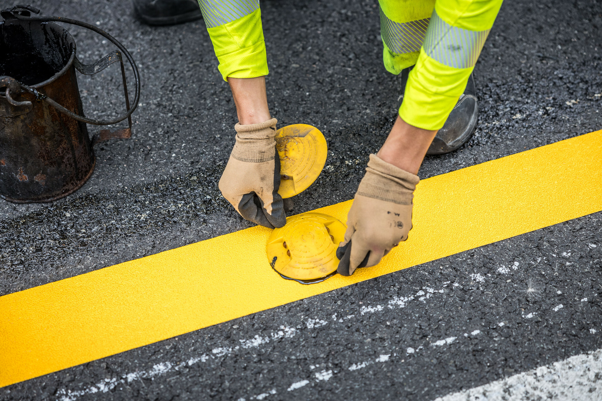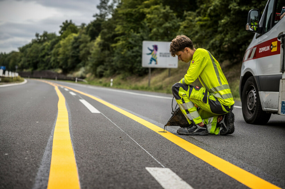 Sicherheit geht vor – vor allem während einer Baumaßnahme. Mit Bitumen befestigt der junge Mann Markierungsknöpfe an der Fahrbahn. Wenn Verkehrsteilnehmende die Linien überfahren, werden sie von den angebrachten Knöpfen sofort darauf hingewiesen.