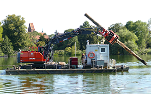 Ganderkesee - Es wirkt, als würde der ATLAS Bagger einen Zahnstocher im Boden versenken. So schnell geht das und so einfach sieht es aus, wenn er einen 10 m langen Anbindepfahl für eine Stegsanierung in die Wakenitz rüttelt. Die Wakenitz ist ein rechter Nebenfluss der Trave im Südosten Schleswig-Holsteins, der den Ratzeburger See entwässert und etwa 14,9 Kilometer lang ist. Bauforum24 Artikel (14.07.2023): ATLAS Mobilbagger 140W Der ATLAS 190W blue Mobilbagger ist äußerst standfest. Mit enormer Kraft und hydraulischem Feingefühl kann man mit ihm arbeiten. Hier geht's zum vollständigen Beitrag