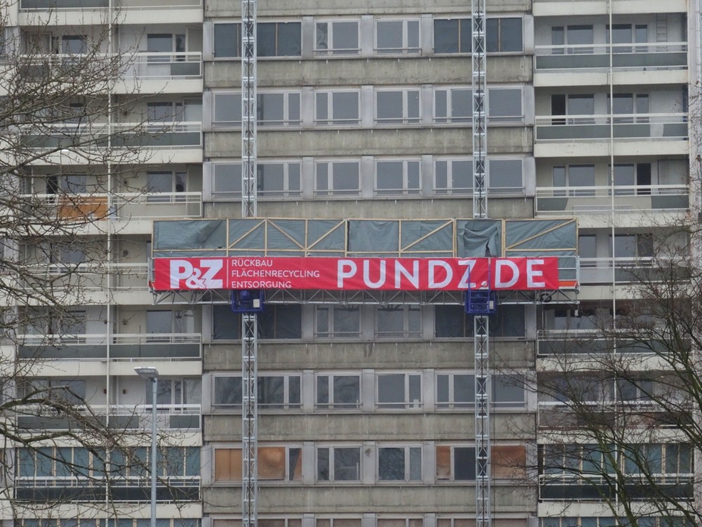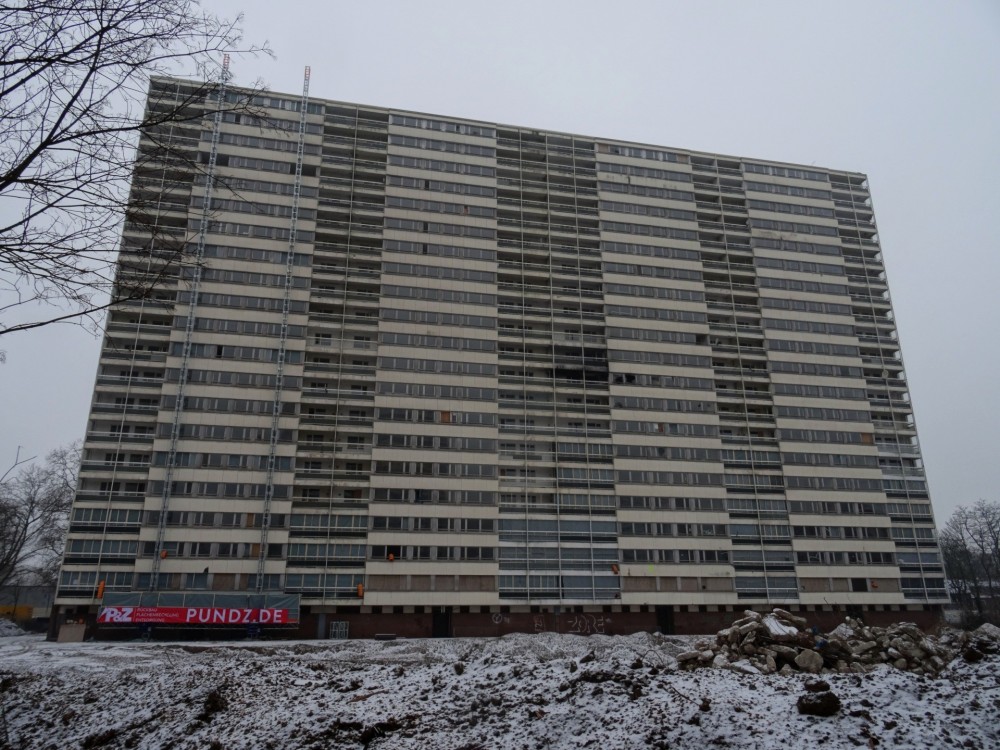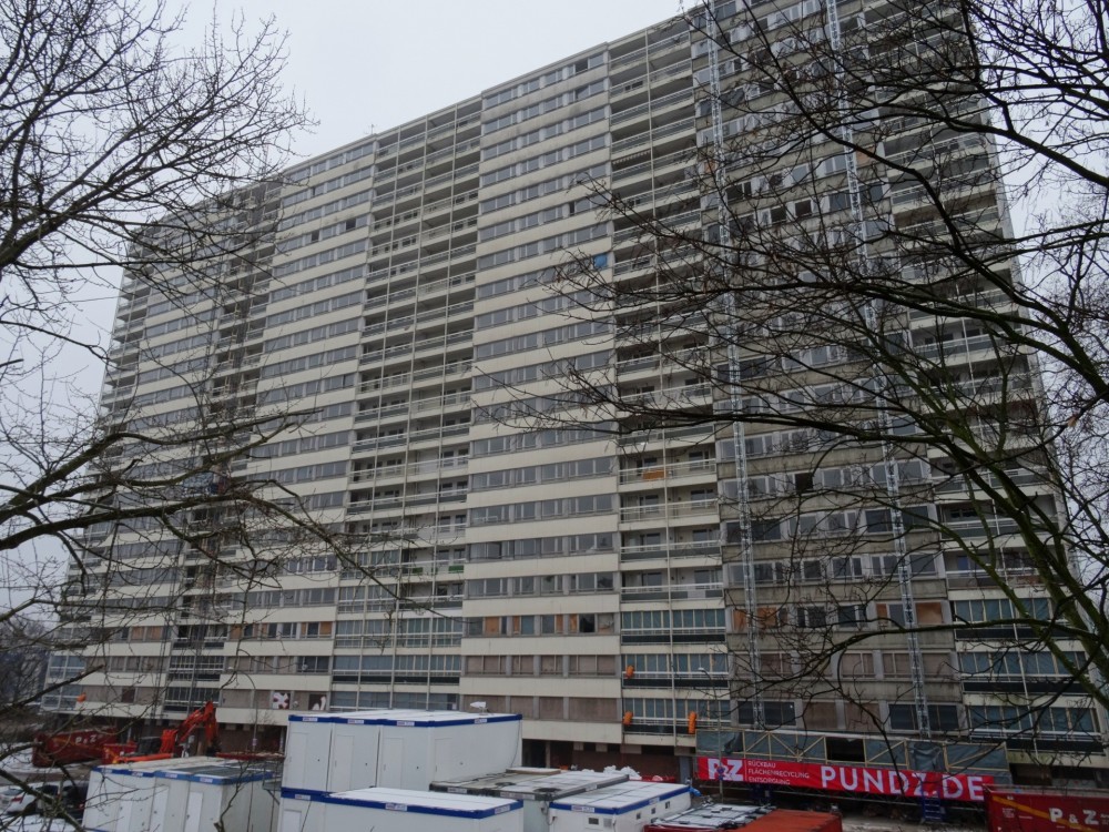 In Duisburg wird zur Zeit das erste Hochhaus von insgesamt 6 Hochhäusern des Wohnparks Hochheide zurückgebaut. Die 20stöckigen Gebäude wurden 1974 fertiggestellt und haben eine Höhe von 60 Metern. Der Wohnpark gilt mittlerweile als sanierungsbedürftig, weshalb die Stadt Duisburg mindestens die beiden leerstehenden Hochhäuser abreißen lassen will. Den Abbruch des ersten Gebäudes an der Friedrich-Ebert-Straße 10-16 hat die Fa. Prangenberg & Zaum aus Viersen übernommen. Die Tiefgarage wurde bereits abgebrochen und aktuell wird das Hochhaus entkernt. Im Herbst dieses Jahr soll die Sprengung erfolgen. Alle Infos rund um den Abbruch: http://www.rp-online.de/nrw/staedte/duisburg/startschuss-fuer-abriss-des-weissen-riesen-in-hochheide-aid-1.6513694 Hier einige Eindrücke vom letzten Dienstag, den 24.01.2017 (Gebäude an der Friedrich-Ebert-Straße): Das Gebäude in voller Größe Spuren vom Vandalismus der vergangenen Jahre Blick aus Richtung Kaufland Mit Aufzügen werden die Schadstoffe aus dem Gebäude nach unten befördert Vielleicht gibt es ja Mitglieder aus diesem Forum, die hin und wieder an dieser Baustelle vorbei kommen und aktuelle Fotos zum Fortschritt posten können? Grüße, Schrotti- 74 Antworten