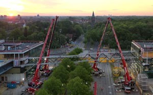 Ehingen/Donau, August 2020 - Mit hohem Aufgebot an Mann und Maschine rückten die Teams des Kran- und Schwerlastunternehmens Nolte auf der Baustelle der neuen Firmenzentrale von Conti zu einem gewaltigen Marathon-Einsatz an. Wo kurz zuvor noch Straßenbahnen und Fahrzeuge ihren Weg durch Hannovers abendliche Rush Hour suchten, waren in kürzester Zeit sechs Liebherr Mobilkrane für ihren anstehenden Job an einer der Hauptverkehrsstraßen der Stadt gerüstet. Ein LTM 1250-6.1, drei LTM 1200-5.1 sowie zwei kleinere Fahrzeugkrane waren zugbereit, als bei Einbruch der Dunkelheit die ersten Brückensektionen angeliefert wurden. Halbzeit: bei Sonnenaufgang werden die Elemente der zweiten Brückenseite an den Kranhaken schwebend verbunden Hier geht's zum vollständigen Beitrag-