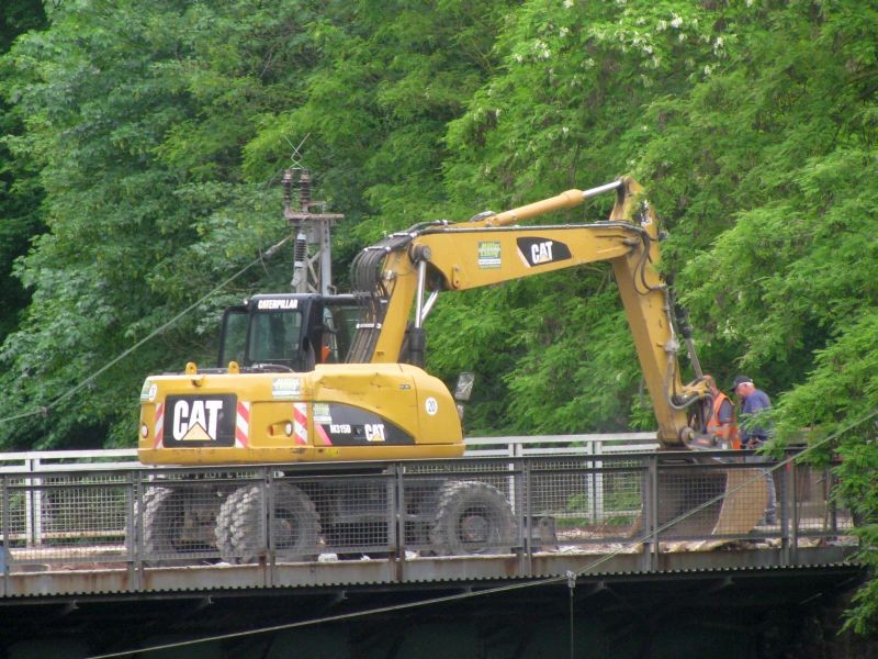 Im Mai 2016 begannen die Bauarbeiten für die neue Fußgängerbrücke. Den Abbruch der alten Brücke führte die auf derartige Arbeiten spezialisierte Firma Möller und Essing aus Georgsmarienhütte bei Osnabrück aus. Der alte Fahrbahnbelag, der hier weitgehend aus Natursteinpflaster bestand wurde mit einem CAT M 315 D entfernt. Anschließend wurde die Stahlkonstruktion freigelegt. Die hier anfallenden Abbruchmaterialien wurden mit einem MAN TGA abtransportiert.